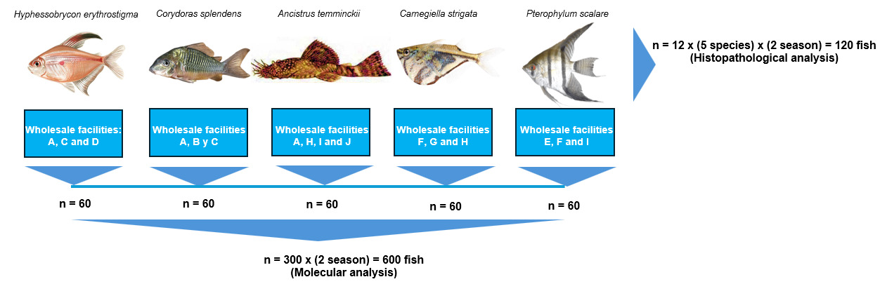 In 2022, fish from 10 ornamental fish wholesale facilities were sampled in two different periods: one during the dry season (August to September) and the second during the rainy season (June to July). The sample size was determined to provide 95 % confidence in detecting Megalocytivirus and Ranavirus with a design prevalence (minimum expected prevalence) of 5%, according to the WOAH Aquatic Animal Health Code, which resulted in a sample size of 60. So, during the study, 60 fish of each of the five target species were collected from ornamental fish wholesale facilities in each season, resulting in a total of 600 fish for molecular analyses that were tested as pool of five fish. Additionally, during the same visits to ornamental fish wholesale facilities in both seasons, 24 fish from each target species were collected for histopathological analysis, totaling 120 fish. The study design is shown in Figure 1.
