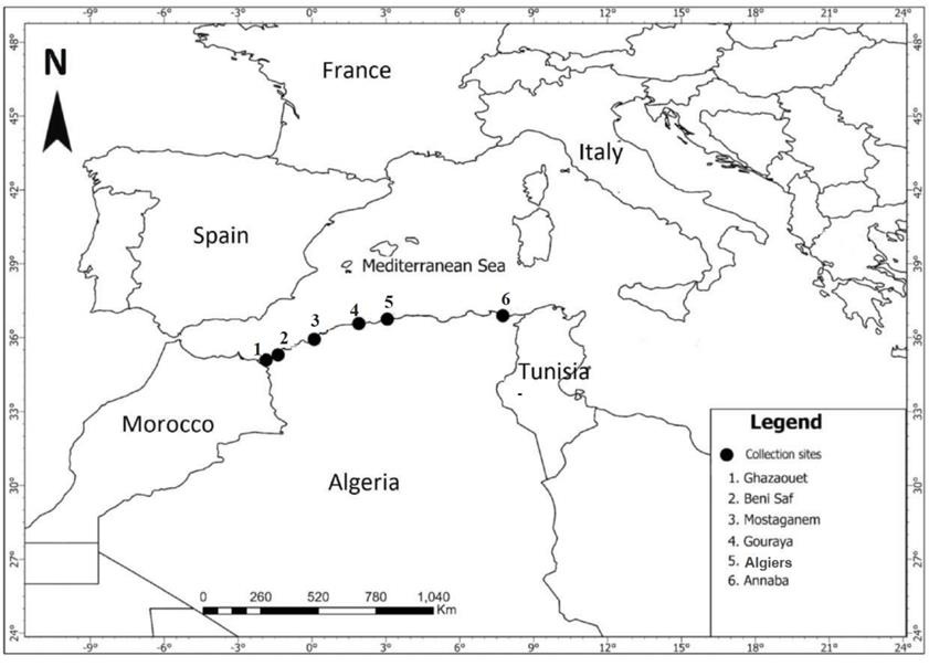 A total of 23 individuals of grouper were collected between May 2023 and July 2024 from various sites along the Algerian coast (Ghazaouet, Beni-Saf, Gouraya, Algiers, and Annaba) (Figure 1). All specimens were captured during fishing activity and noted to present cutaneous lesions and ocular opacity (Figure 2), with the majority collected during periods of elevated water temperature (around 25°C), a condition known to trigger betanodavirus activation and the onset of clinical signs associated with NNV disease (Toffan et al. 2016).