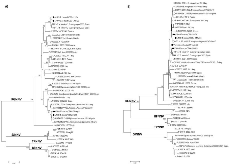 In this study, a virological and phylogenetic analysis was conducted to investigate and characterize the nervous necrosis virus in E. costae and E. marginatus, collected from different regions of the Algerian coast.
