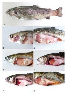 Spontaneous infection was found in rainbow trout broodstock in raceway culture where the fish were kept in a concrete tank (8 × 0.8 × 0.8 m) at a density of 110 kg m-3 and the water had the following physical and chemical characteristics: temperature 7–9 °C, dissolved O2 10.1–11 mg L-1, pH 7.1–7.3, total hardness 4.8–5 °N, chemical oxygen demand (CODMn) 2.8–3.2 mg L-1, nitrites (NO2-) 0.051–0.067 mg L-1 , nitrates (NO3-) 5.7–6.9 mg L-1 and ammonium (NH4+) 0.14–0.38 mg L-1. The examined fish had a standard length of 100–115 mm and were fed dry pelleted feed containing 40 % crude protein (N × 6.25) and 14 % crude fat. Ten affected fish and ten fish without clinical signs were subjected to clinical, necropsy, parasitological, bacteriological and haematological examination.